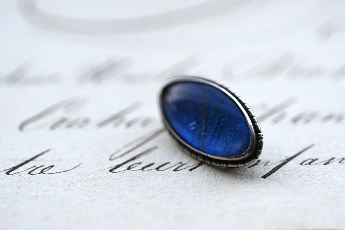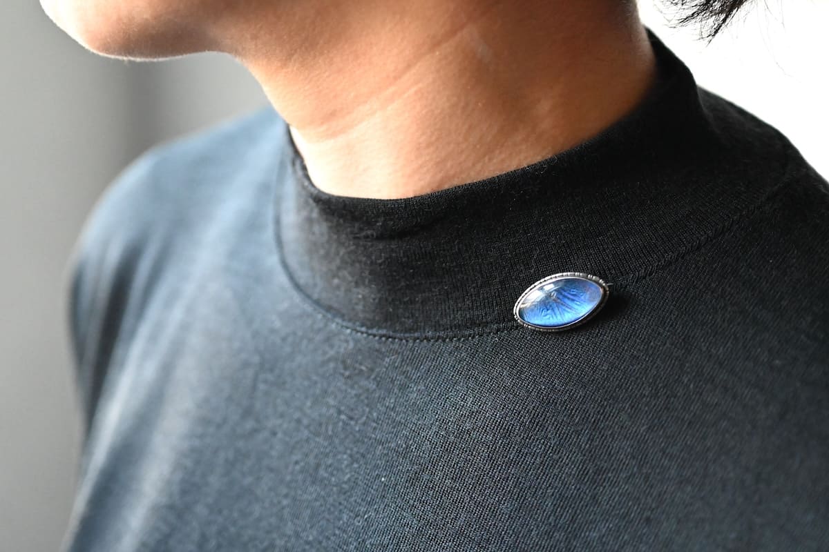 「世界で一番美しい」と言われるモルフォ蝶の羽を、そのままガラスに閉じ込めたブローチ。