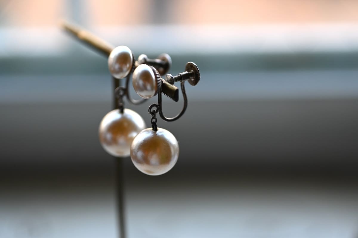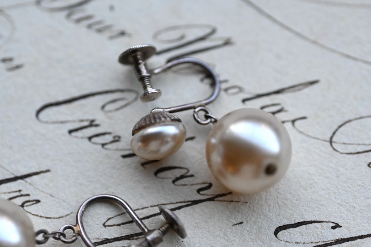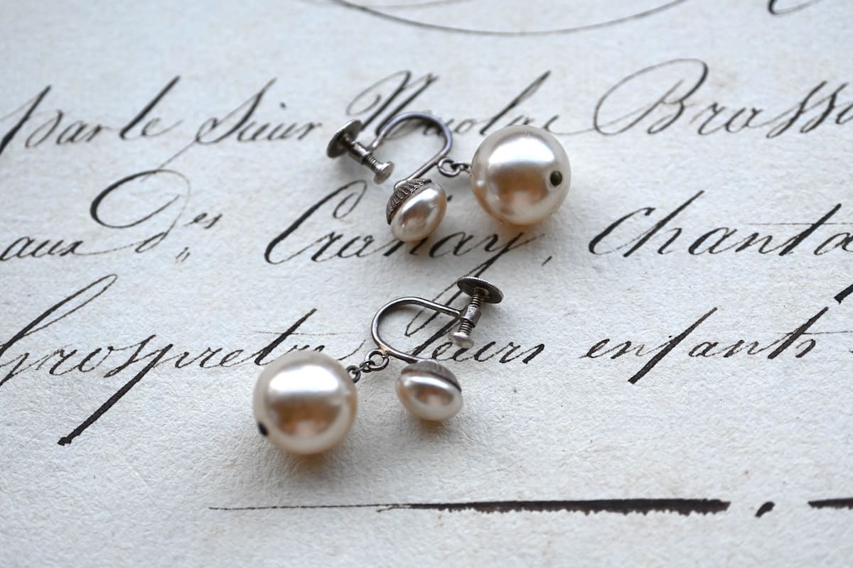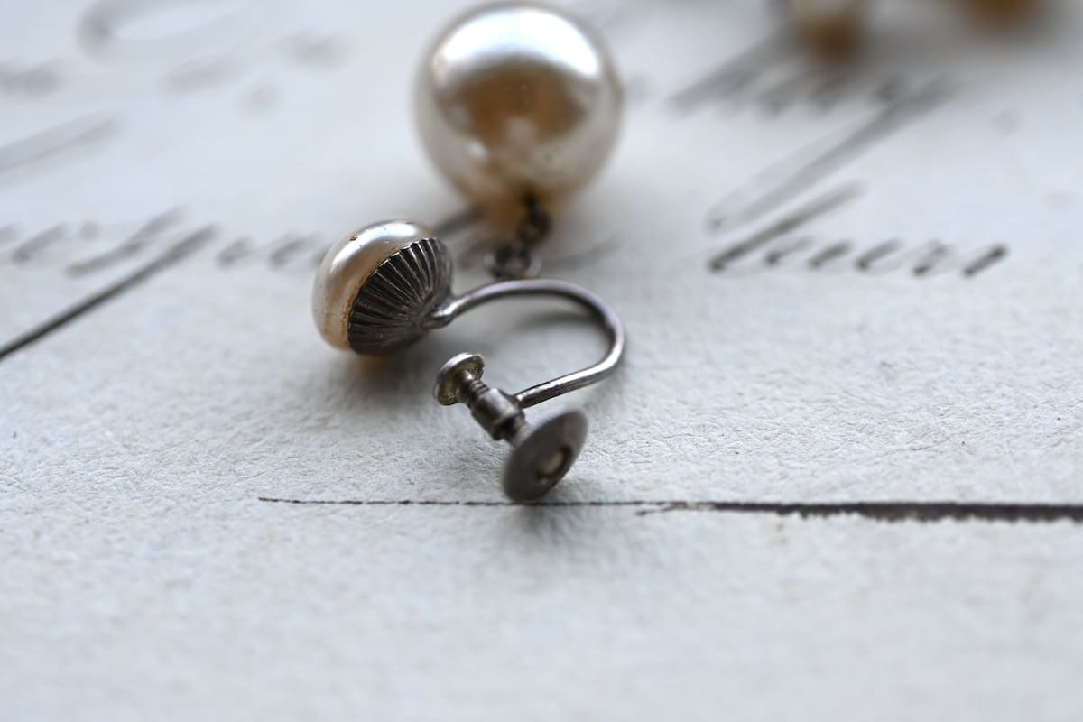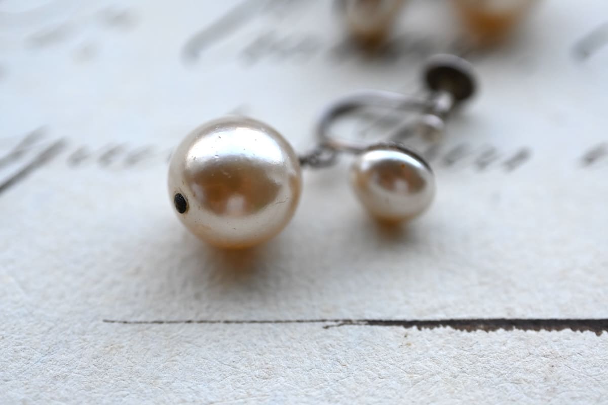 イミテーション(模倣)パールのドロップイヤリング。