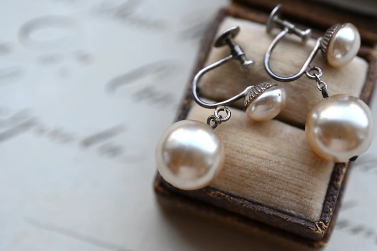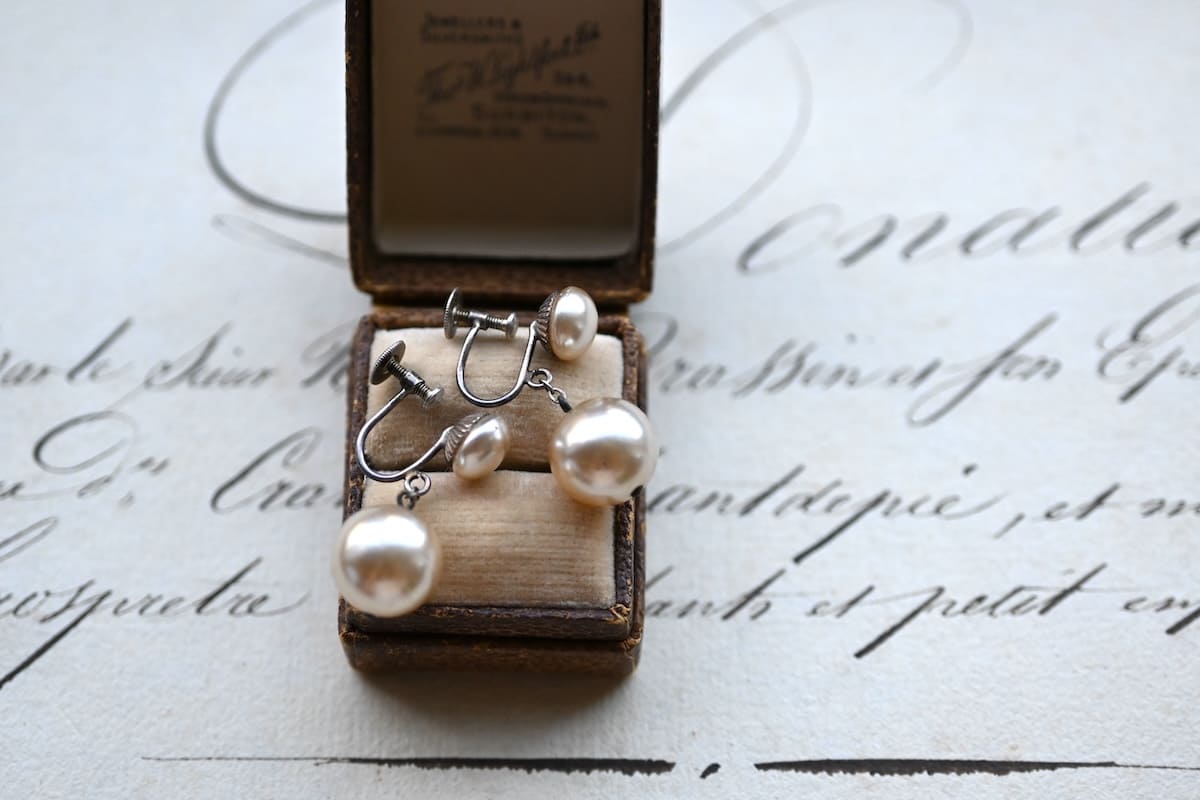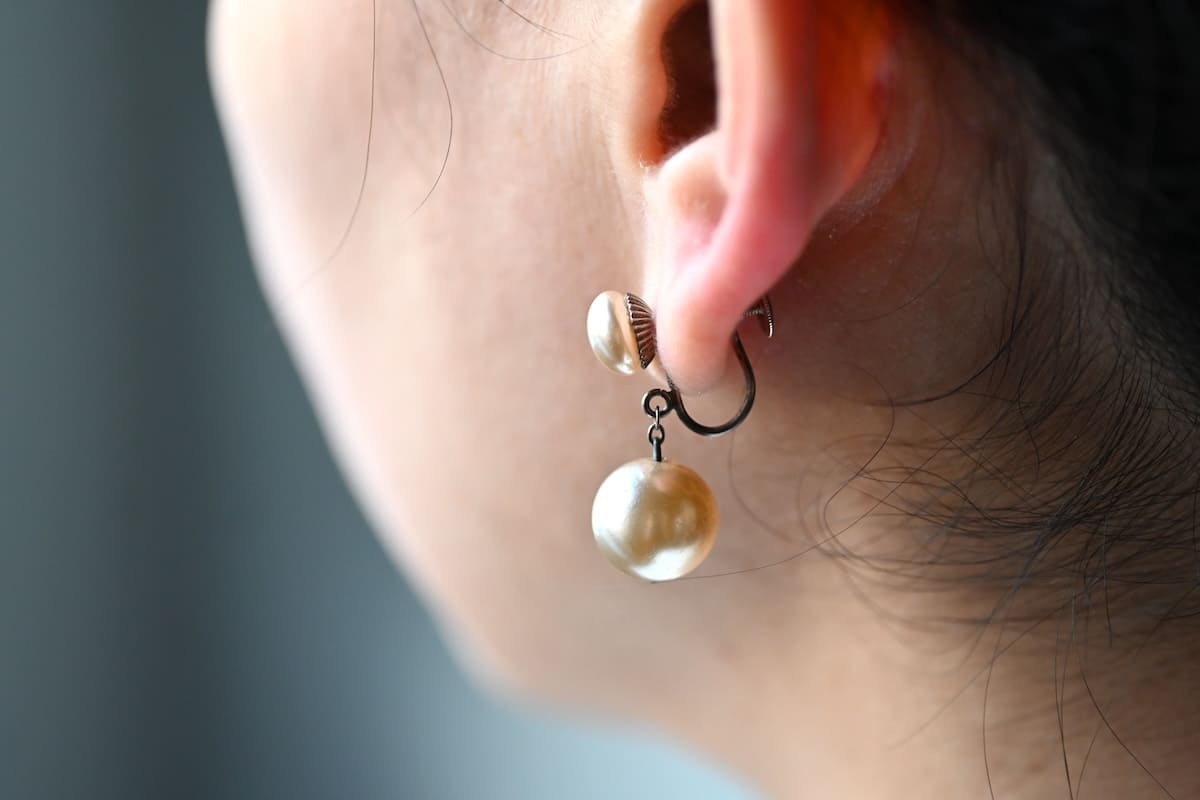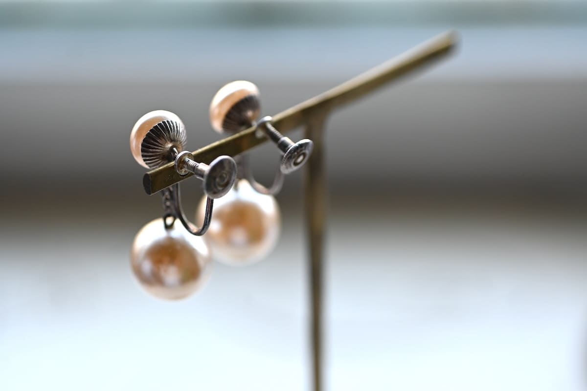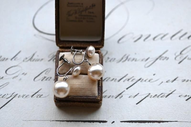 イミテーション(模倣)パールのドロップイヤリング。