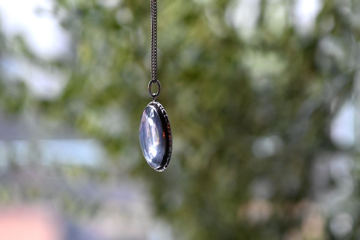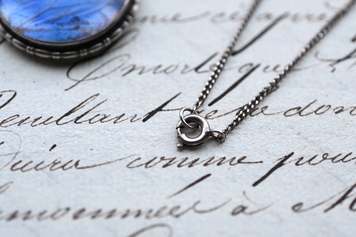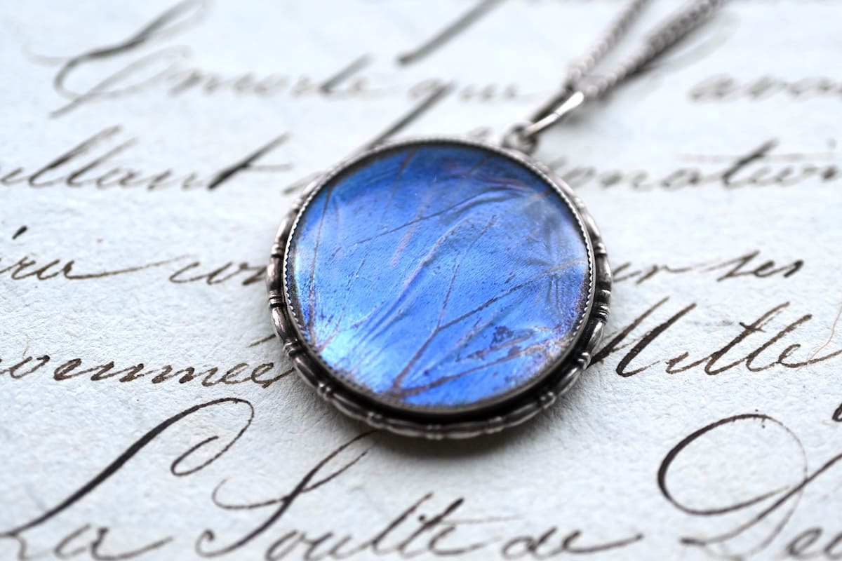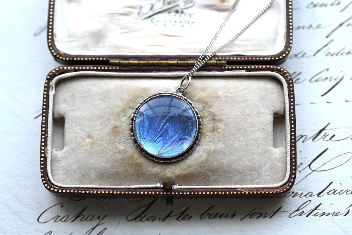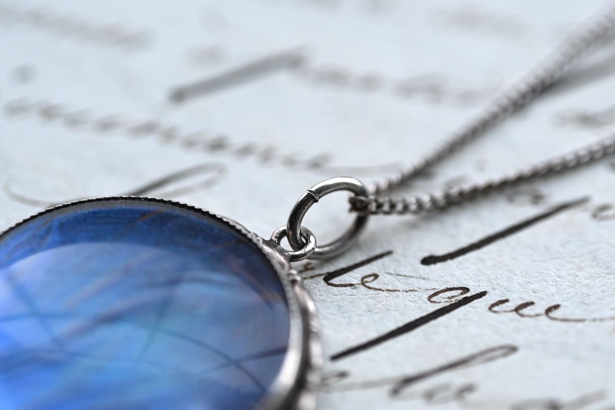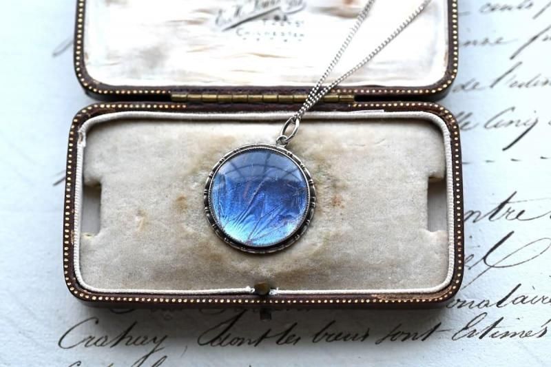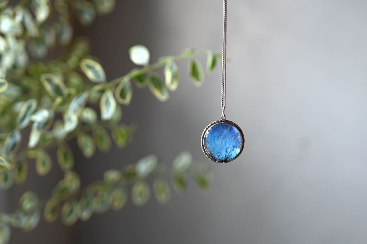 「世界で一番美しい」と言われるモルフォ蝶の羽を、そのままガラスに閉じ込めたネックレス。