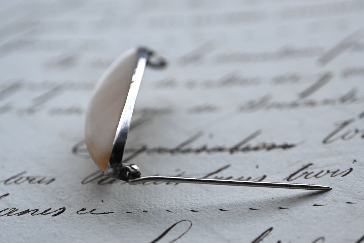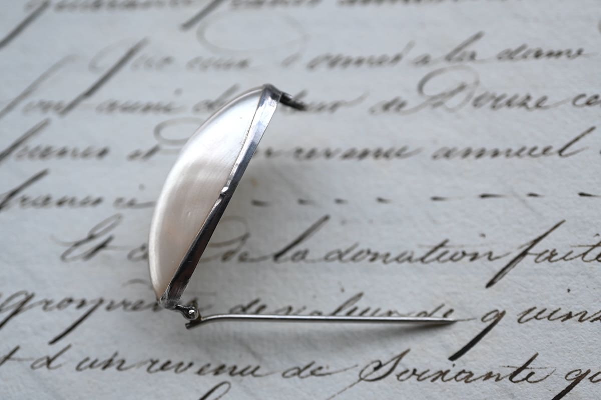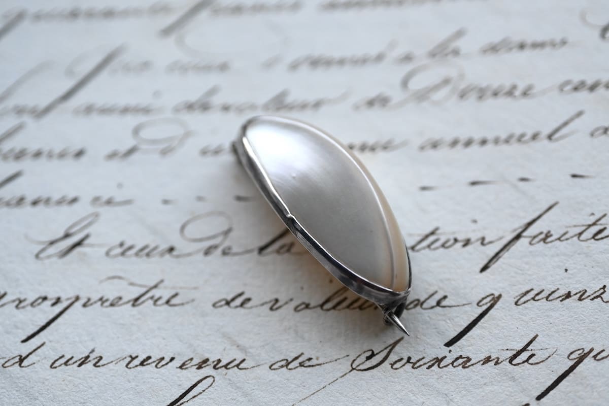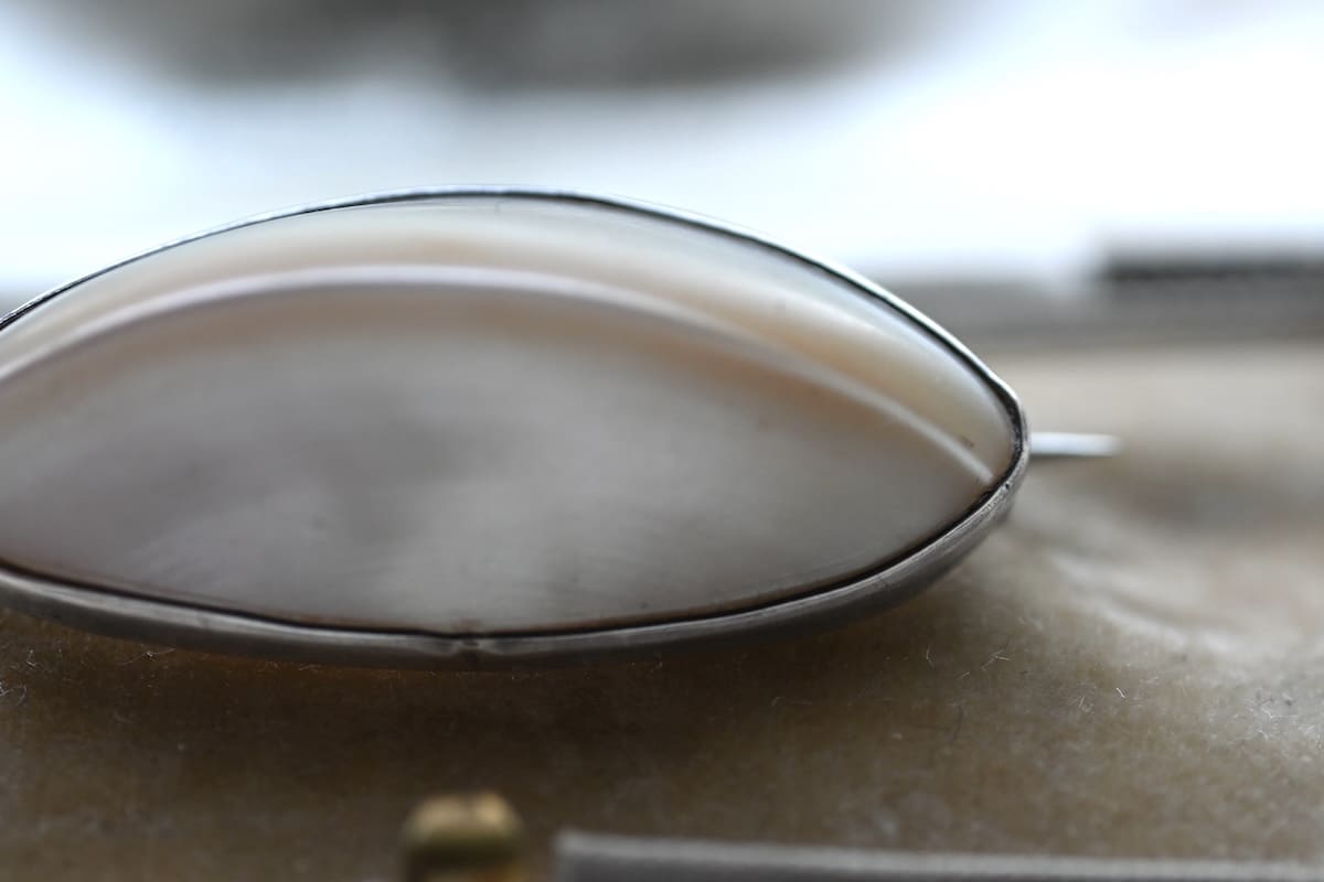 真珠を生成する真珠母貝であるマザーオブパールから作られたブローチです。