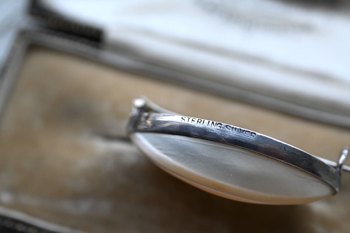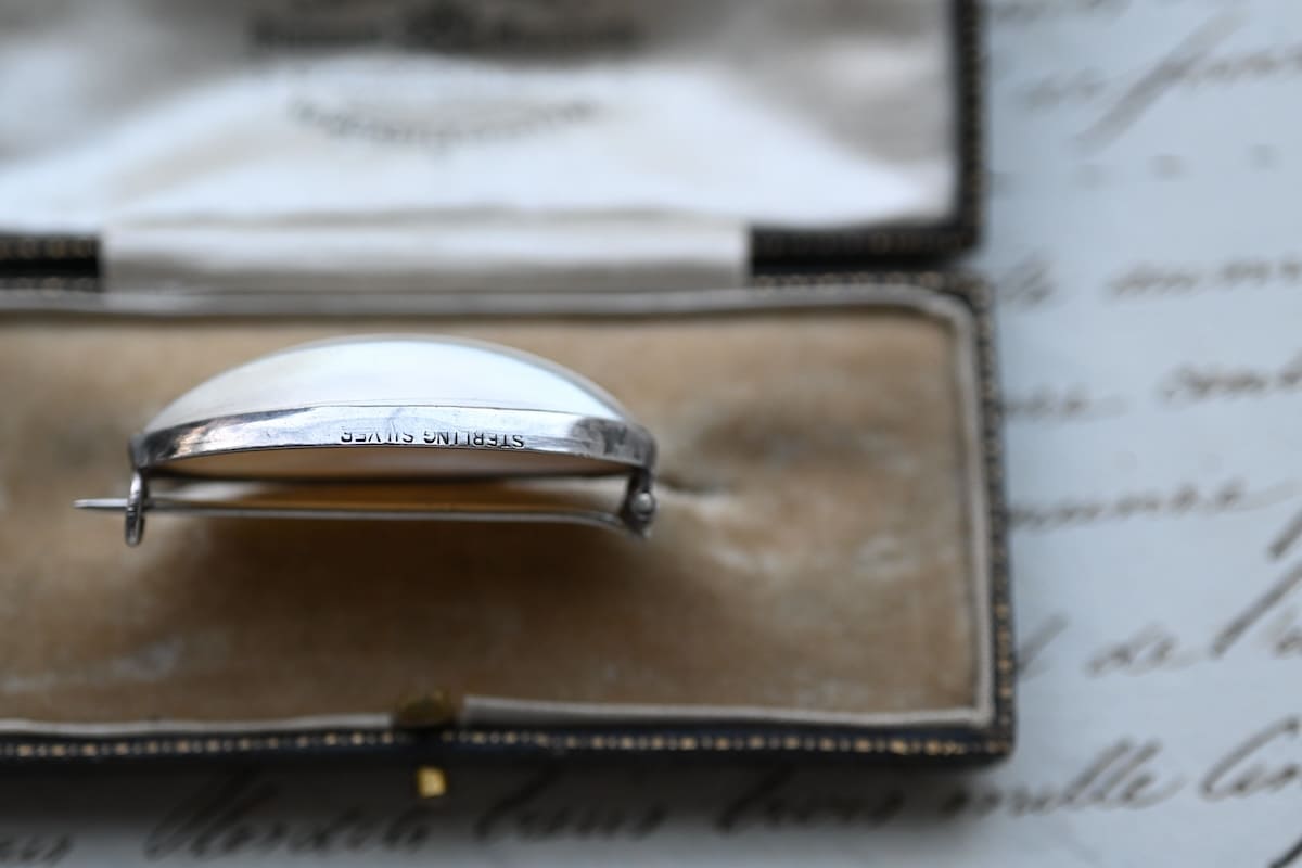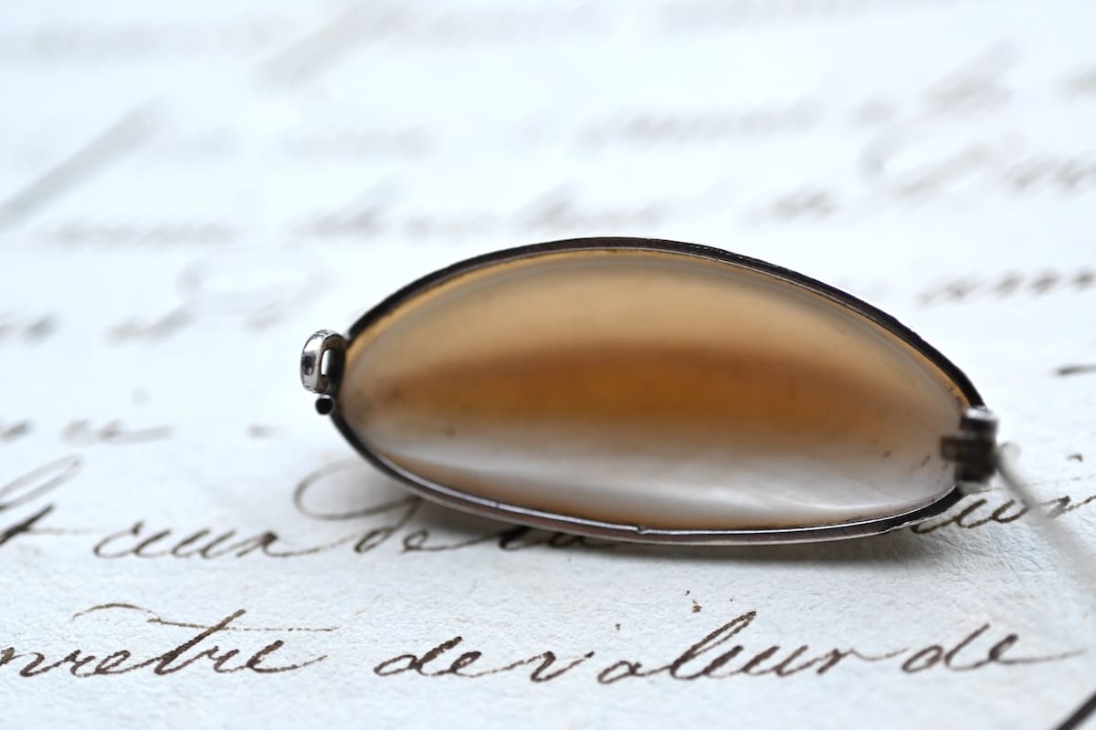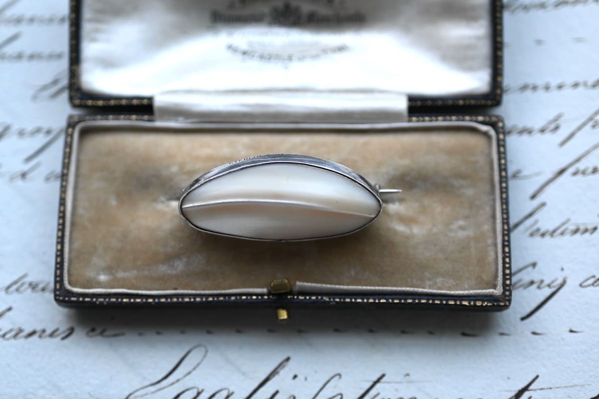 真珠を生成する真珠母貝であるマザーオブパールから作られたブローチです。