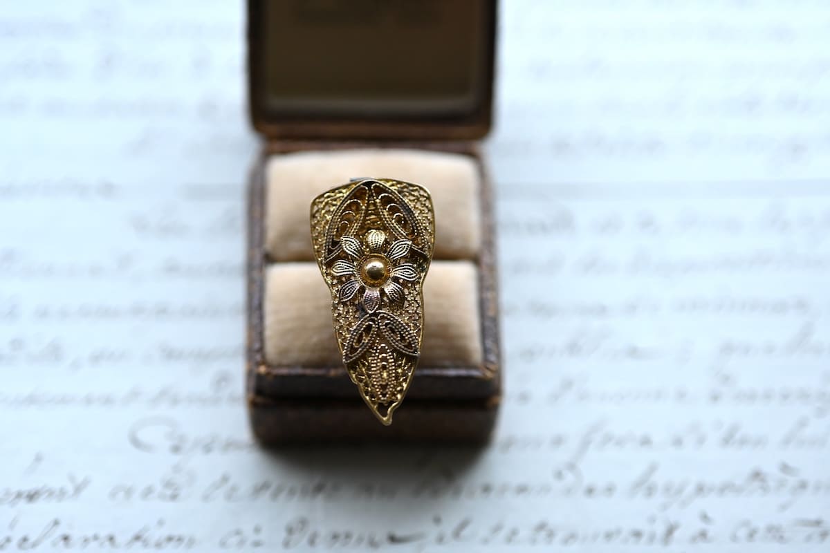 1940年代頃に作られた、真鍮製のドレスクリップ。透かし編みのようなベースに葉や花を模したフィリグリー細工が施された、どこかオリエンタルな雰囲気の一点です。
