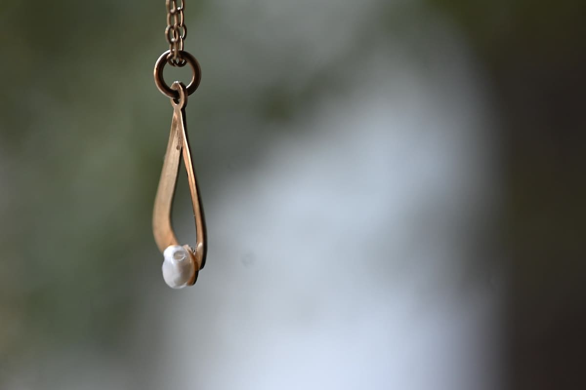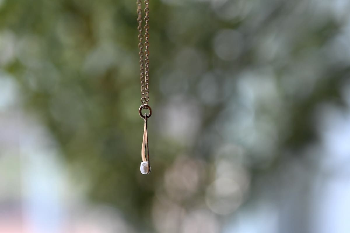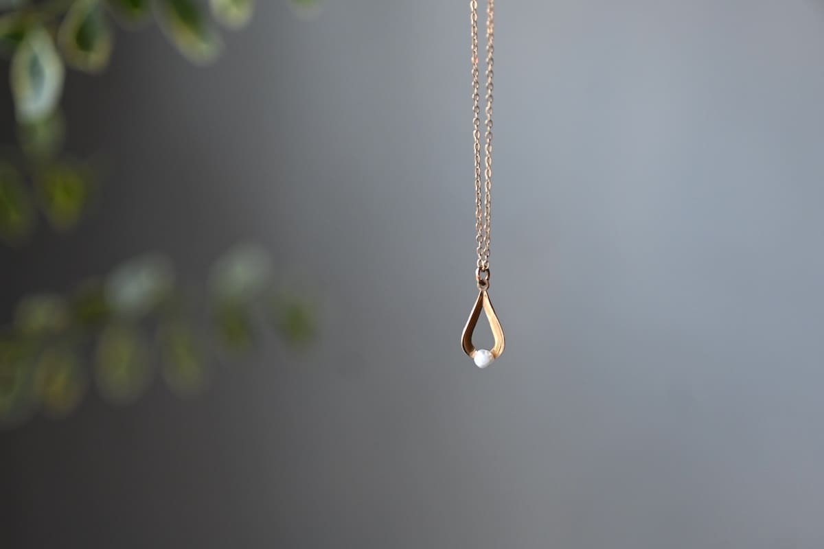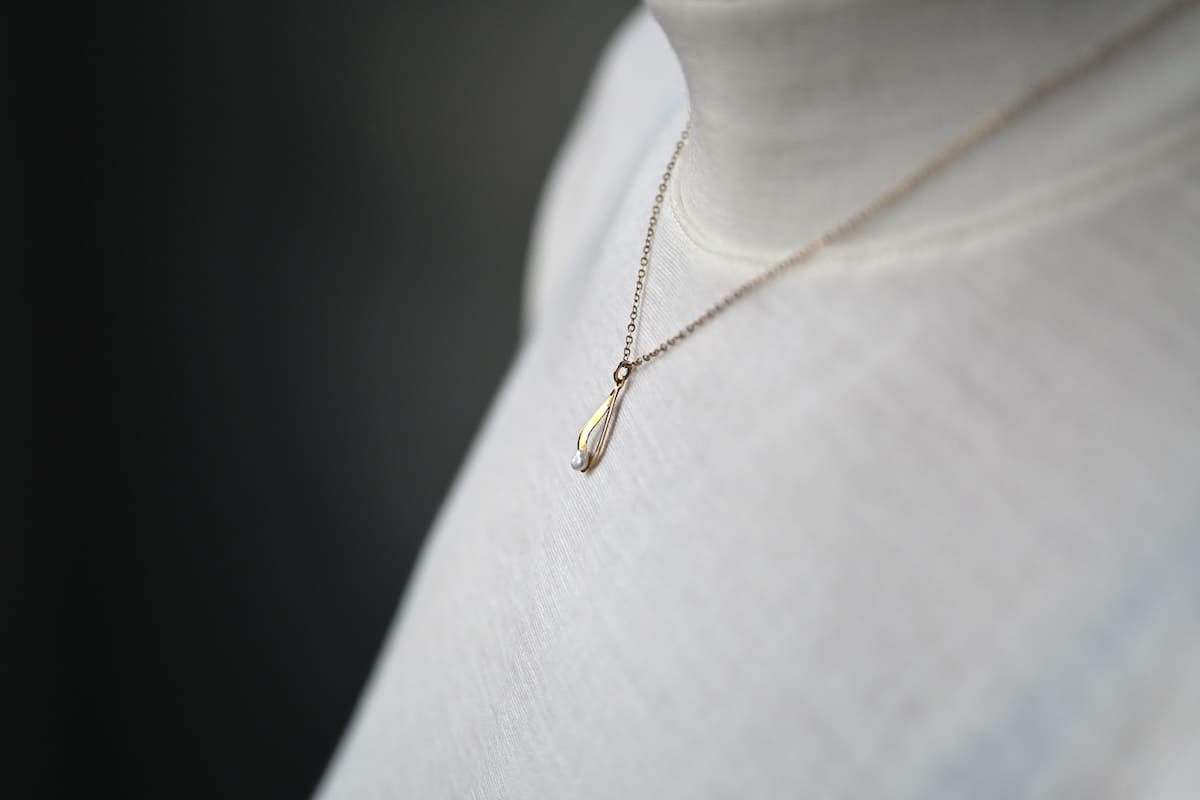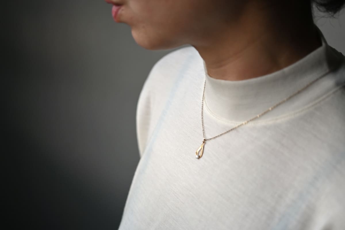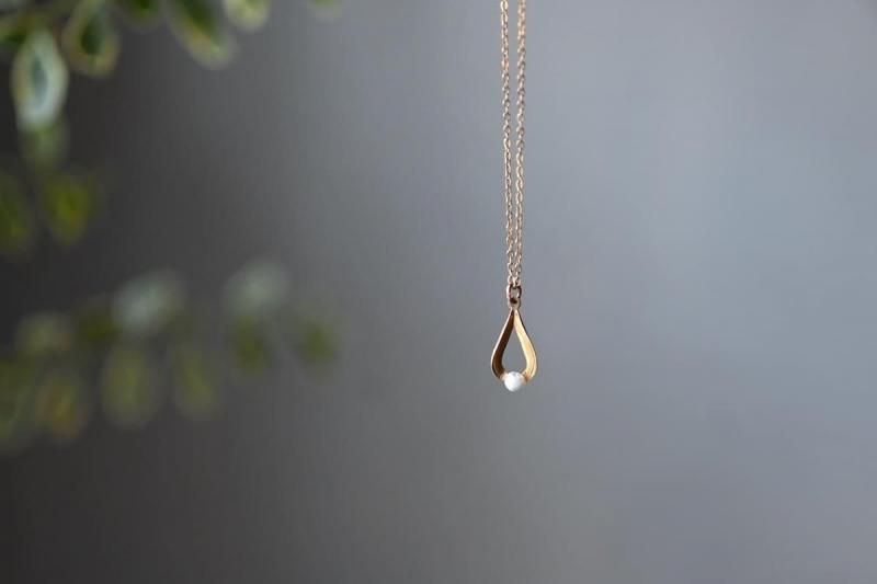 雫型をした平たい枠だけのゴールドプレートに、パールが一粒施されたネックレス。