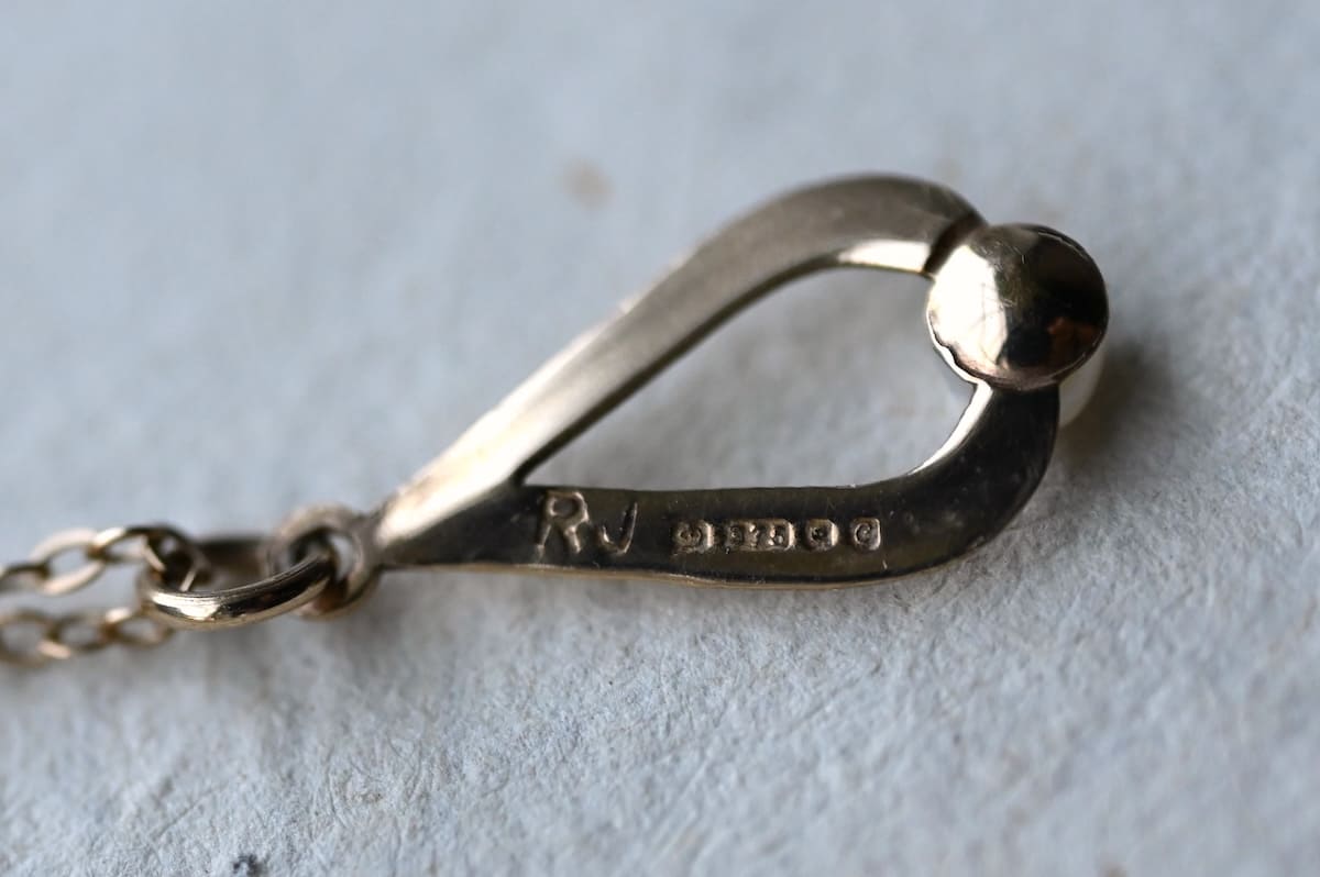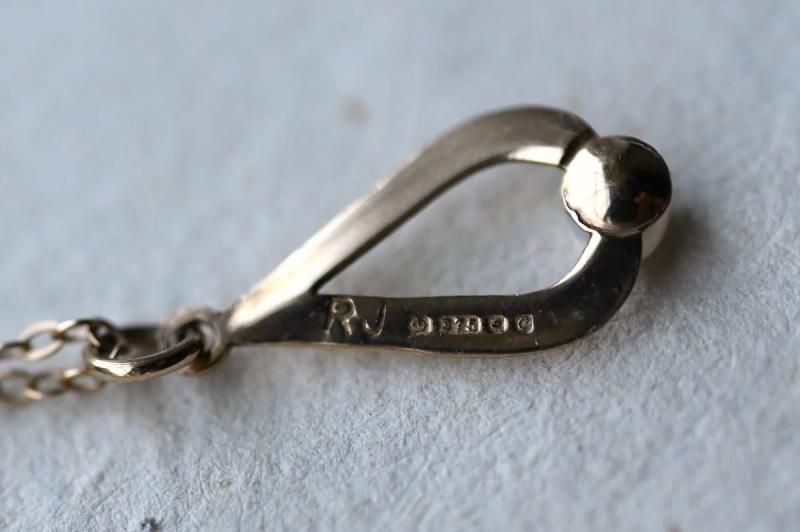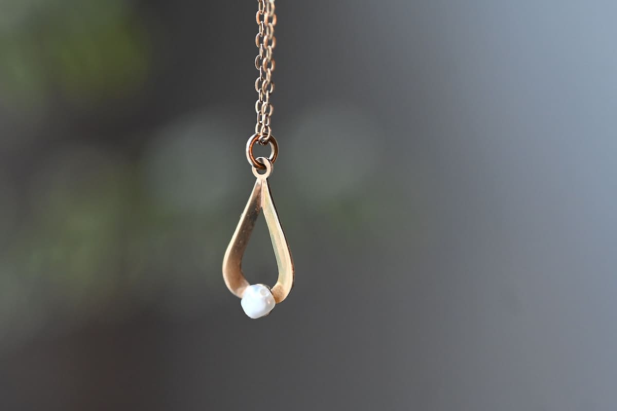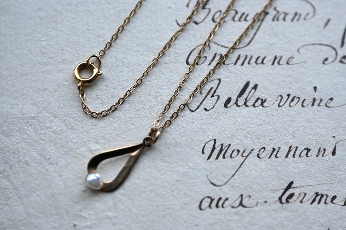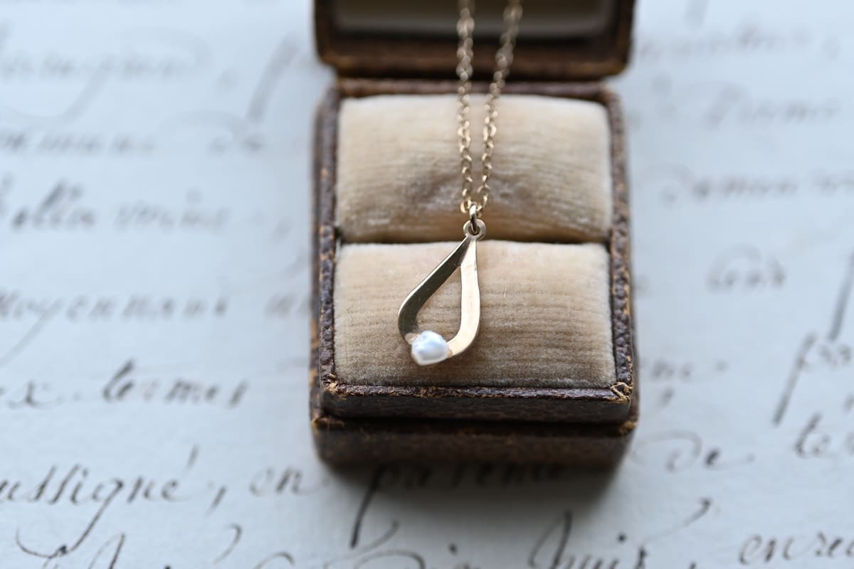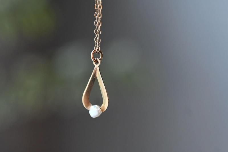 雫型をした平たい枠だけのゴールドプレートに、パールが一粒施されたネックレス。