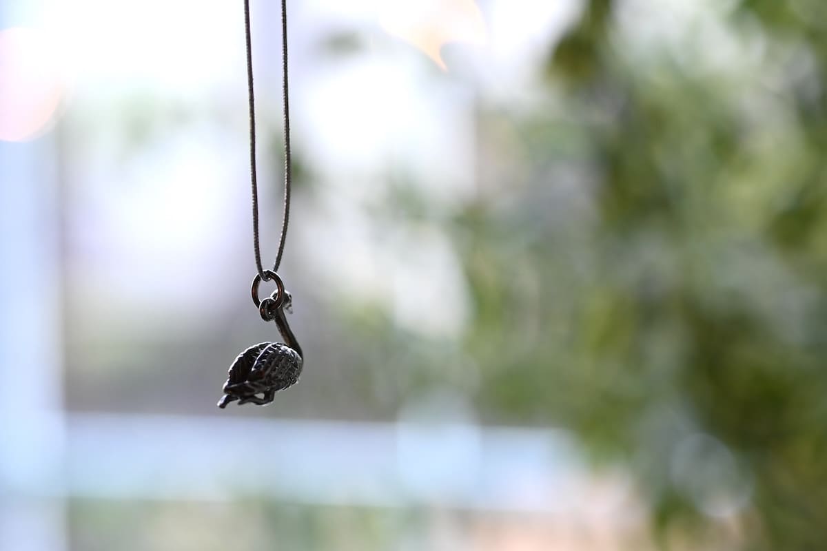 頭部に丸カンが付いており、紐の交換も可能です。シルバーチェーンとも相性も良さそうです。