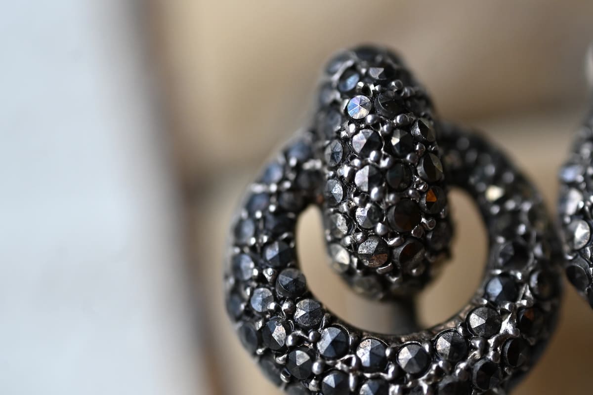 ぎっしりとセットされたマーカサイトは、どの角度から見ても美しく輝き、華やかな印象です。