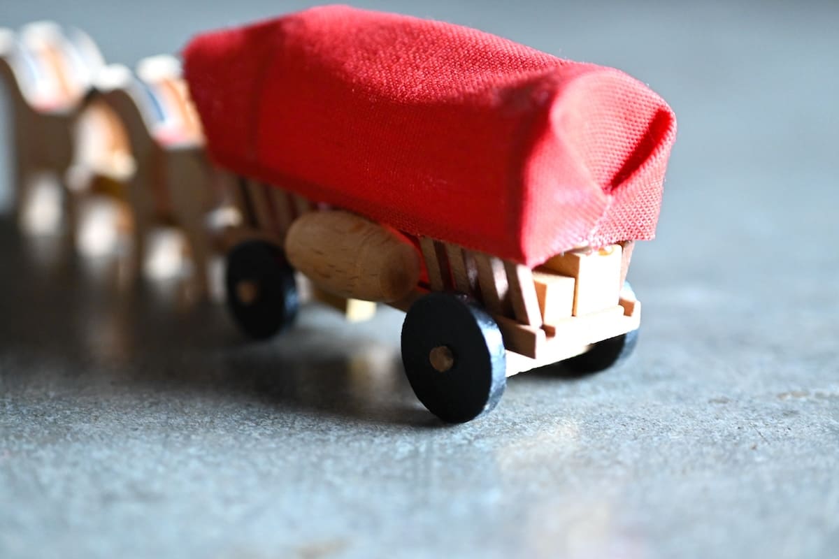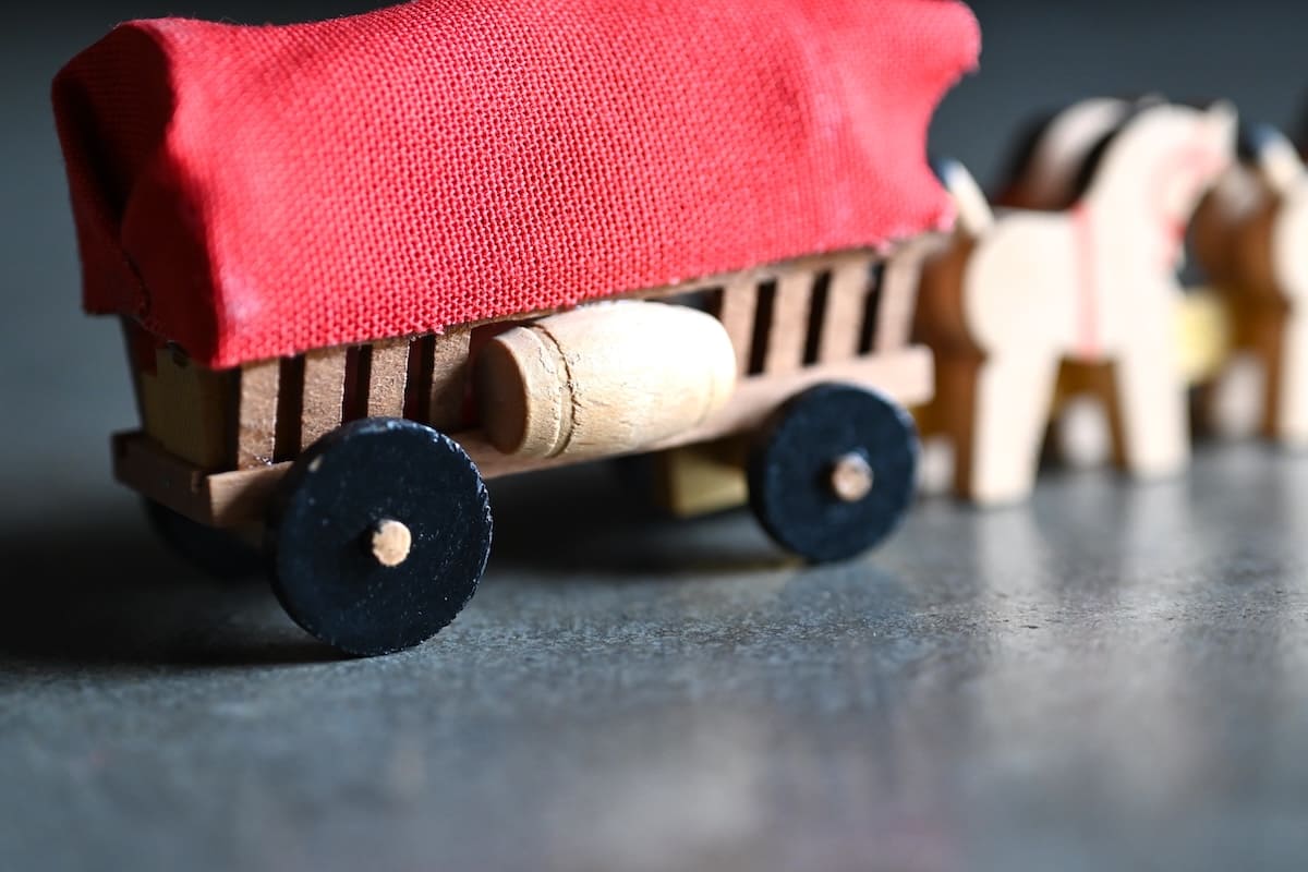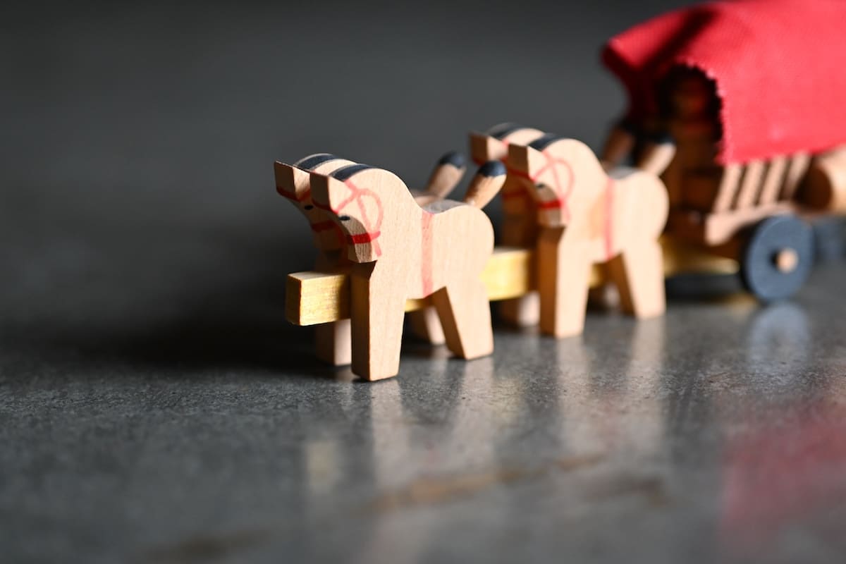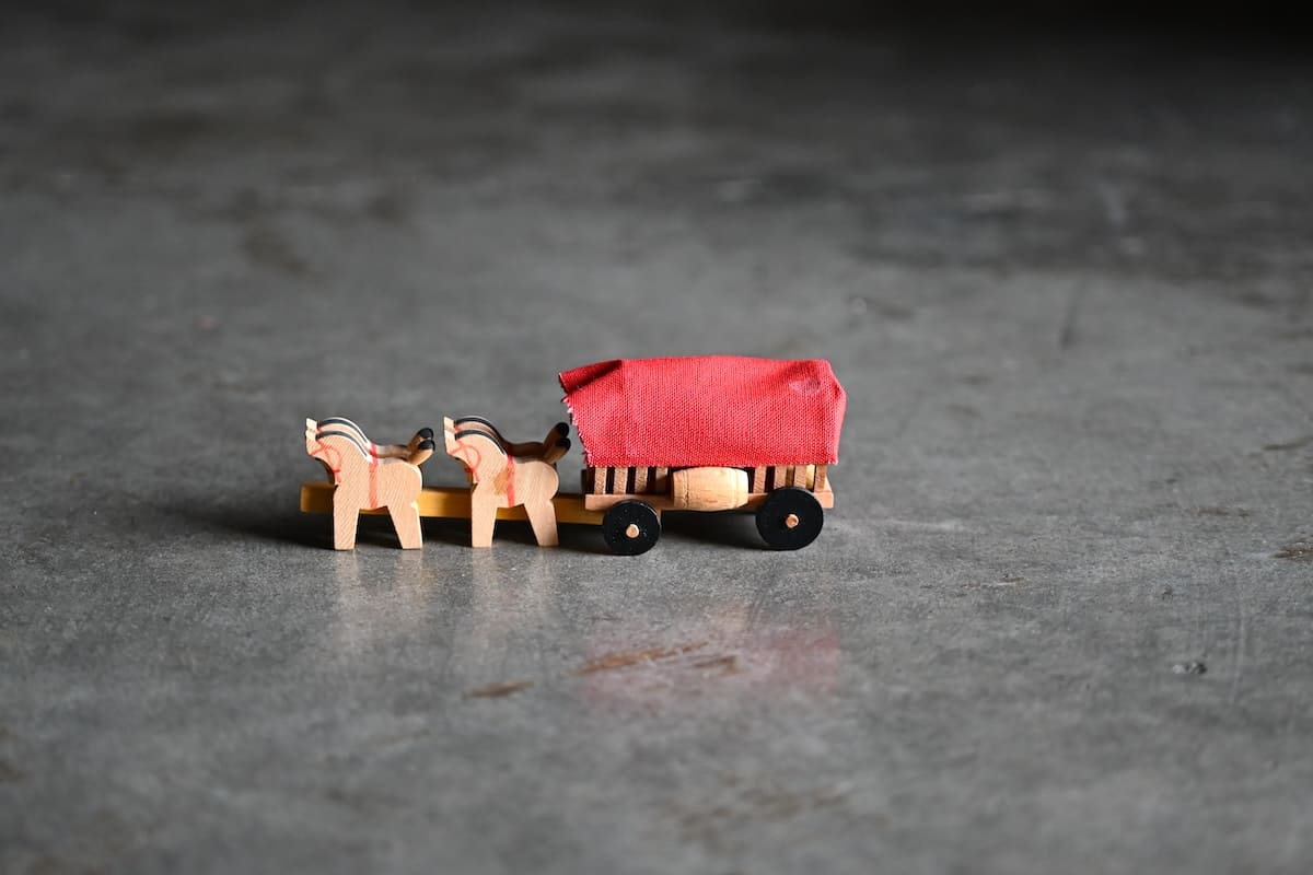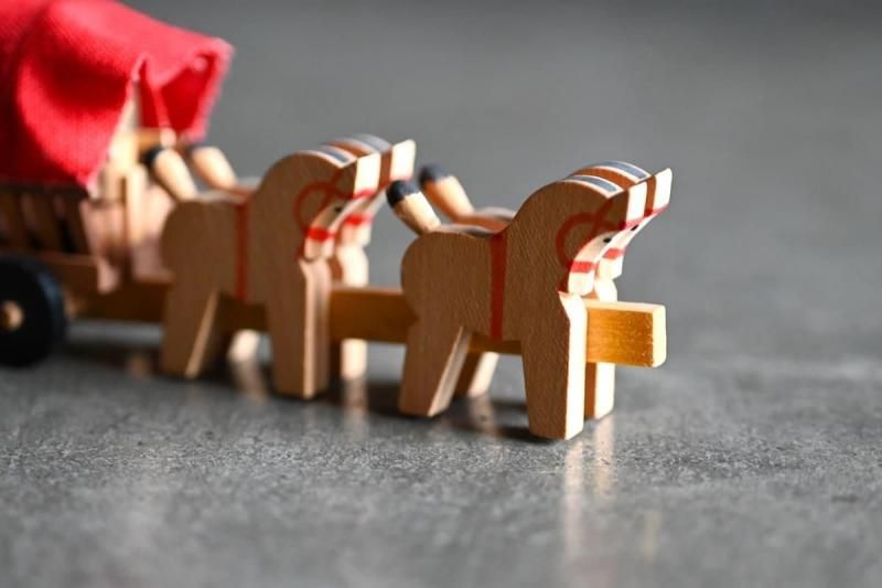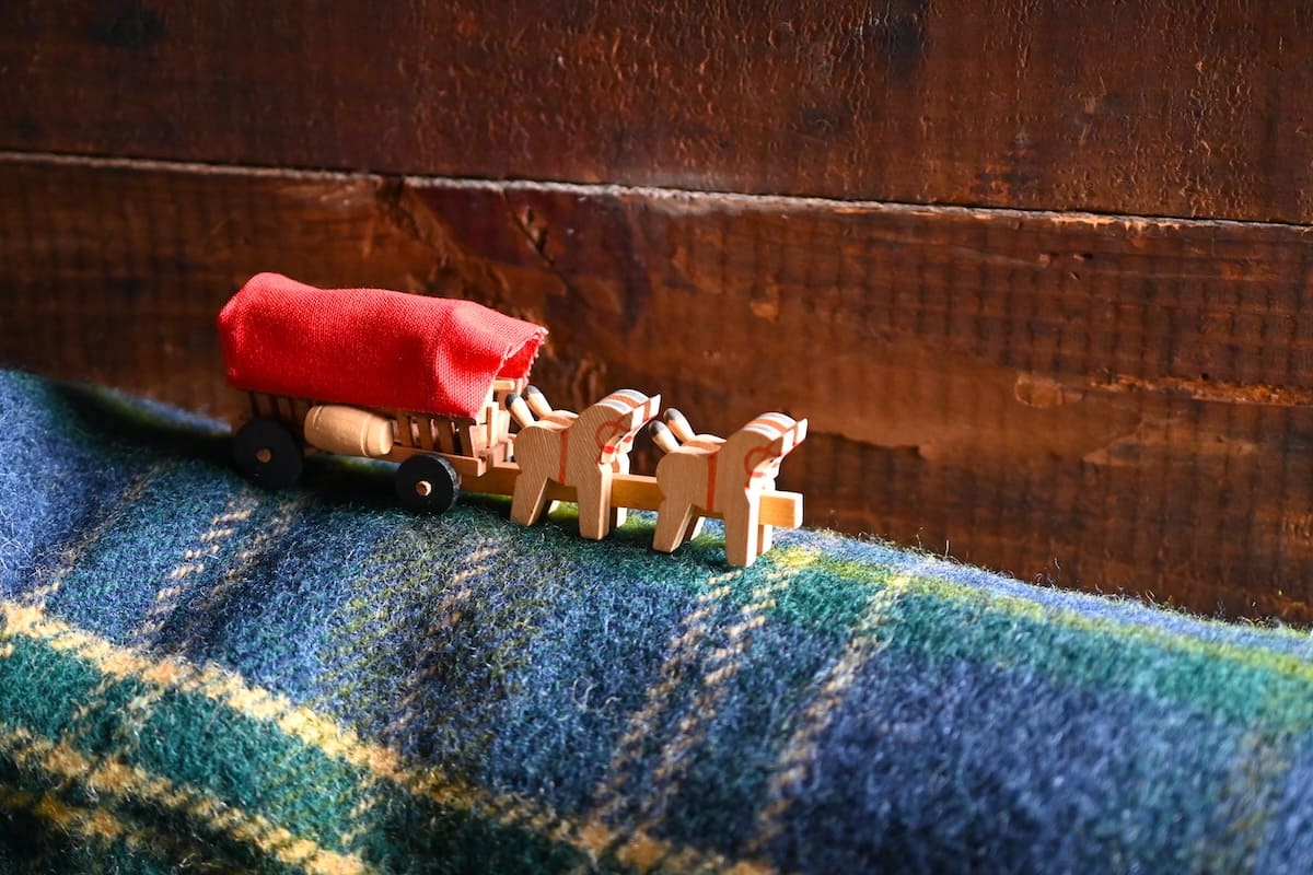 コロンと丸いフォルムの愛らしい馬が4頭、赤い布がかけられた荷車を引いています。